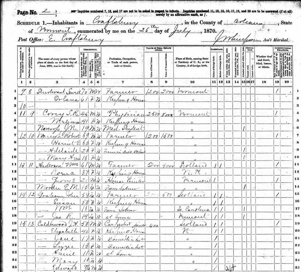 Tracing the Calderwood and Smith families back to earlier generations is difficult. There are descendants in the Ancestry databases who think they know who the previous generation were, but there is no documentation to support these claims. It turns out there is a reason for this. The Proceedings of the Vermont Historical society published an article in 1996 entitled Scots Among the Yankees: The Settlement of Craftsbury East Hill, by Bruce P. Shields, which provides an explanation…