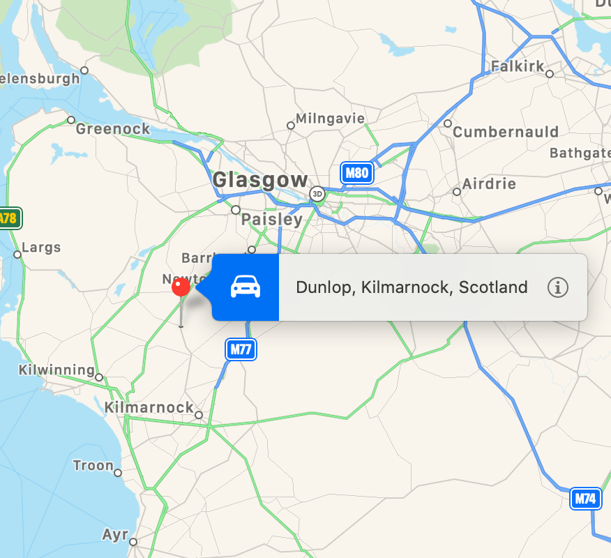 The family of great grandmother Annavilla (Annie) Agnes Calderwood came from Dunlop, Ayrshire Scotland, about 15 miles southwest of Glasgow. Her father, John Calderwood (1822-1896), arrived in the United States in 1841 at age 18 or 19.
