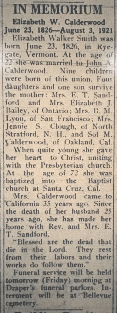 At least three of Annie’s siblings also moved to California at various times, all mentioned in Elizabeth’s 1921 obituary. Elizabeth Bailey lived in Ontario (and is buried in Bellvue).