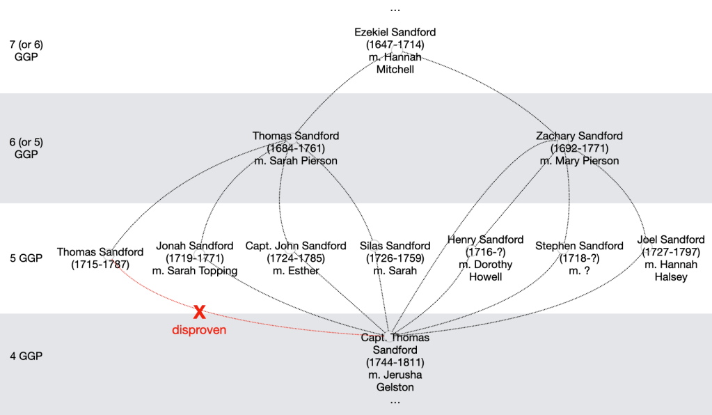 Using both Josephine and Grover’s accounts (which vary in the level of detail but don’t seem to have other major disagreements) I traced enough generations of Robert’s descendants to try to identify any other possible Bridgehampton Sandford families that Thomas (3a) could have come from. This is not as difficult a task as it might seem—by the sixth generation down from Robert we go beyond the timeline of interest; we can ignore all female offspring since we are looking for a father named Sandford; the range of dates when any particular candidate might have been having children makes it possible to eliminate quite a few possibilities; and there are quite a few other families that already have a child named Thomas and can be eliminated. The resulting analysis fits comfortably on one page.