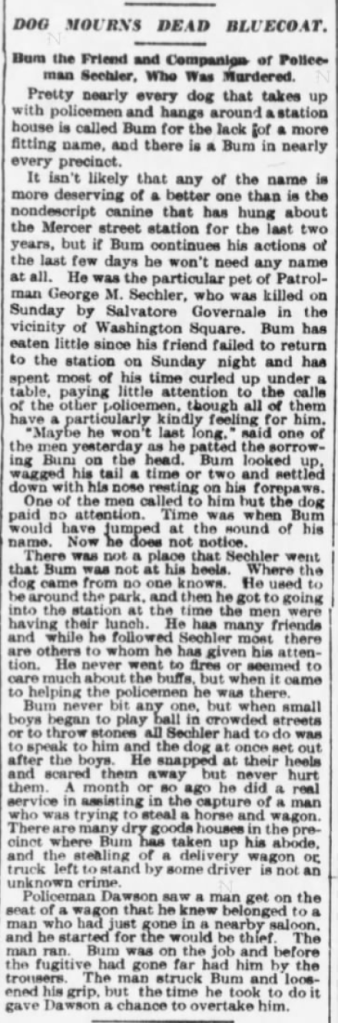 Until proven otherwise, I choose to believe that the reporter and perhaps some of Georgeʼs fellow officers conspired to put Bum on the train to Danville with George’s casket to allow Bum to spend the rest of his days in the Danville countryside with the Sechler family.
