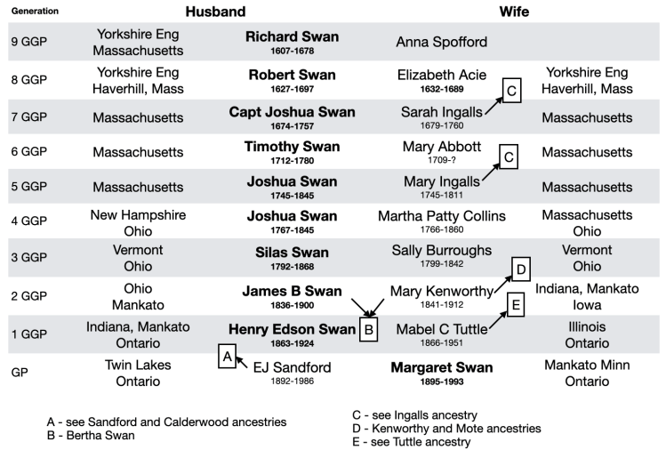 Knowing the connection(s) from the Swan to the Ingalls family opens up new world of distant ancestors to investigate. Ninth great grandfather Edmund Ingalls was a significant ancestor as shown below.