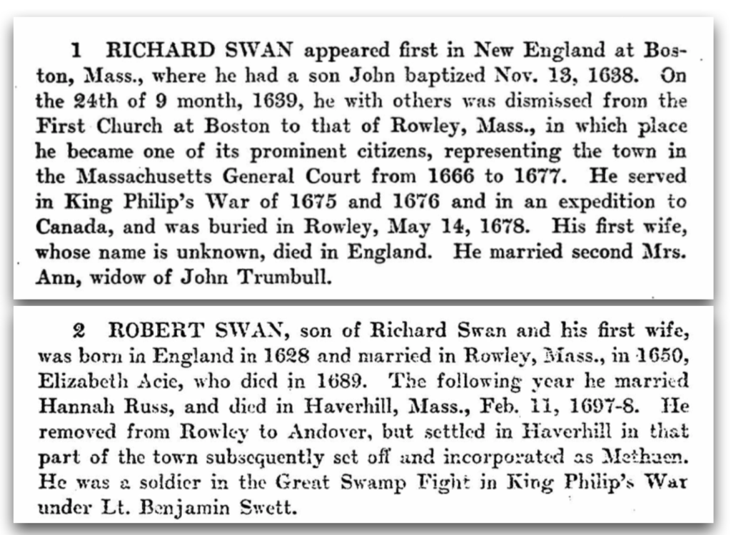 Richard and Robert Swan can be found in Ancestors of Alden Smith Swan… by Josephine Frost, published in 1923. They are noted for their roles in King Philip’s War (1675-1676), one of the final attempts of the Indians of southern New England to drive out the English settlers.