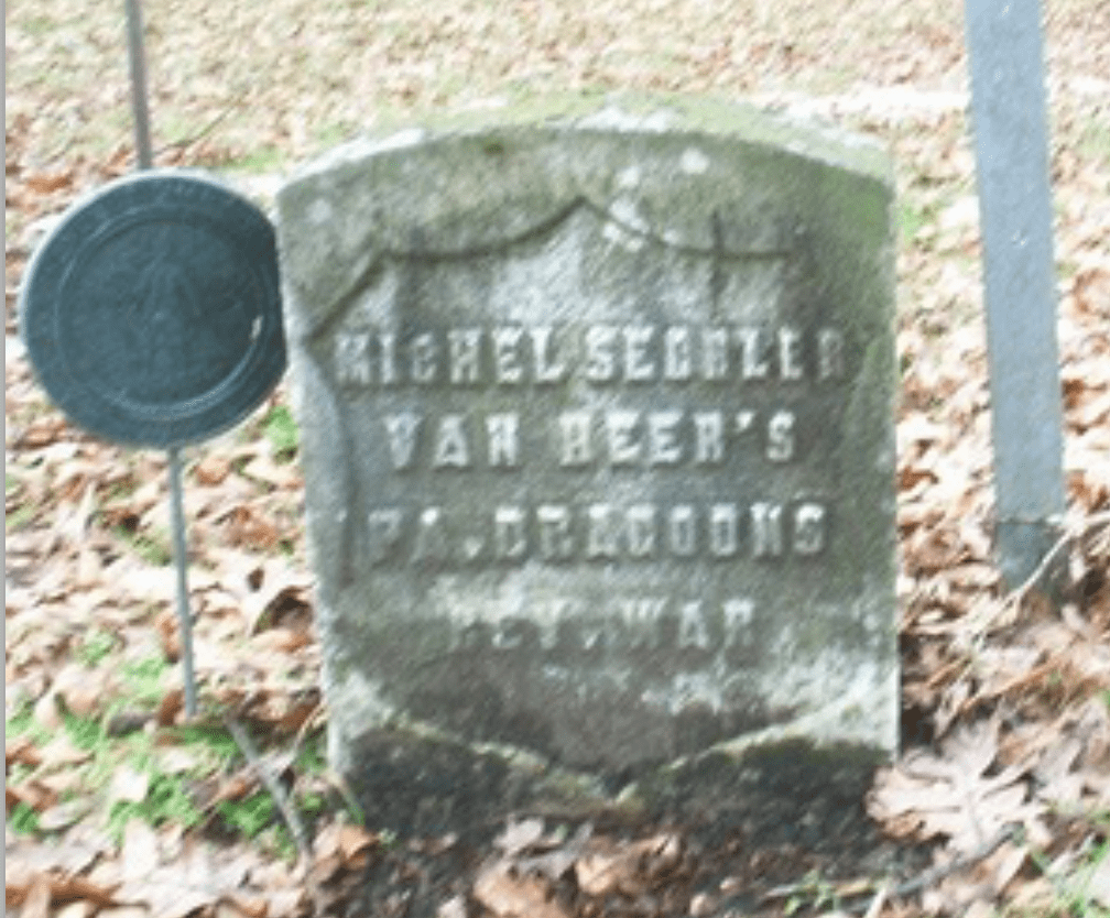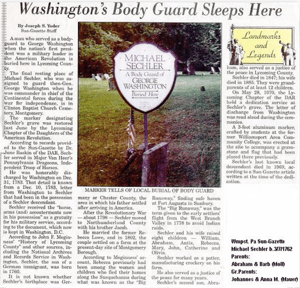 Michael Sechler (1762-1847) was the son of our fifth great uncle Abraham Sechler, whose role in the attack of 1757 was described in a previous post. A marker at Michael’s grave in Montgomery, Pennsylvania (central Pennsylvania between Danville and Williamsport; note that this is different from Montgomery County in southeastern Pennsylvania where the Sechler family lived earlier) commemorates his role as a member of Major Van Heer’s Pennsylvania Dragoons, whose duties included protection of General George Washington.