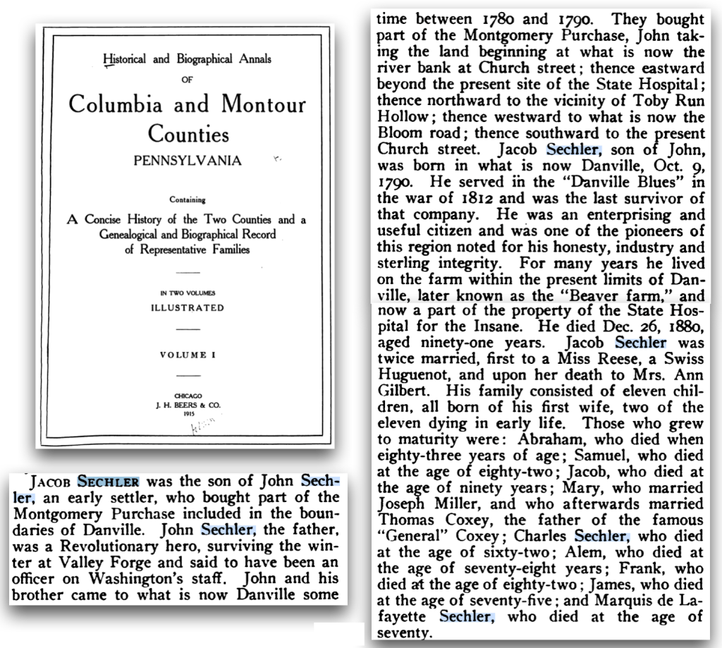 John Sechler (1739-1831) was Abraham Sechler’s (ten years younger) brother, Michael Sechler’s uncle. Several biographical sources credit John with being an officer on George Washington’s staff, such as the following, mainly about John’s son Jacob (not to be confused with John’s brother Jacob).