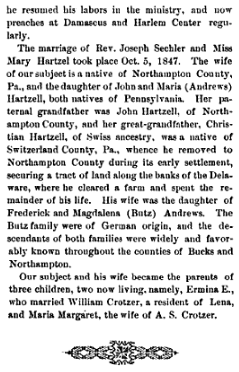 Of course it is the Joseph Sechler branch, our direct ancestral line, in which we are most interested. For this, there is a source in an obscure 1888 book, Portrait and Biographical Album of Stephenson County, Illinois. Stephenson County is the home of distant cousins who’s genealogy intersects ours. A profile of Reverend Joseph Sechler provides information we are looking for. Reverend Joseph was our third great uncle, a brother of our second great grandfather Aaron Sechler. Reverend Joseph’s ancestors are our ancestors, and the profile tells us about them.