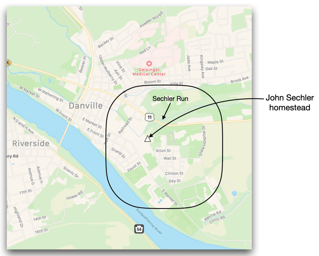 John Sechler’s territory began at Church Street and extended past the present Danville State Hospital grounds, bounded on the north by Bloom Road and on the south by the river.