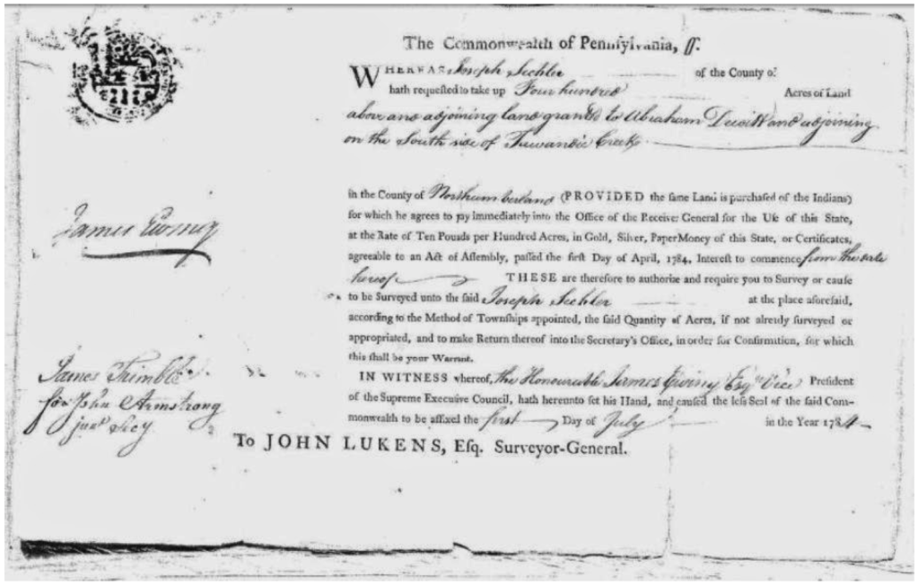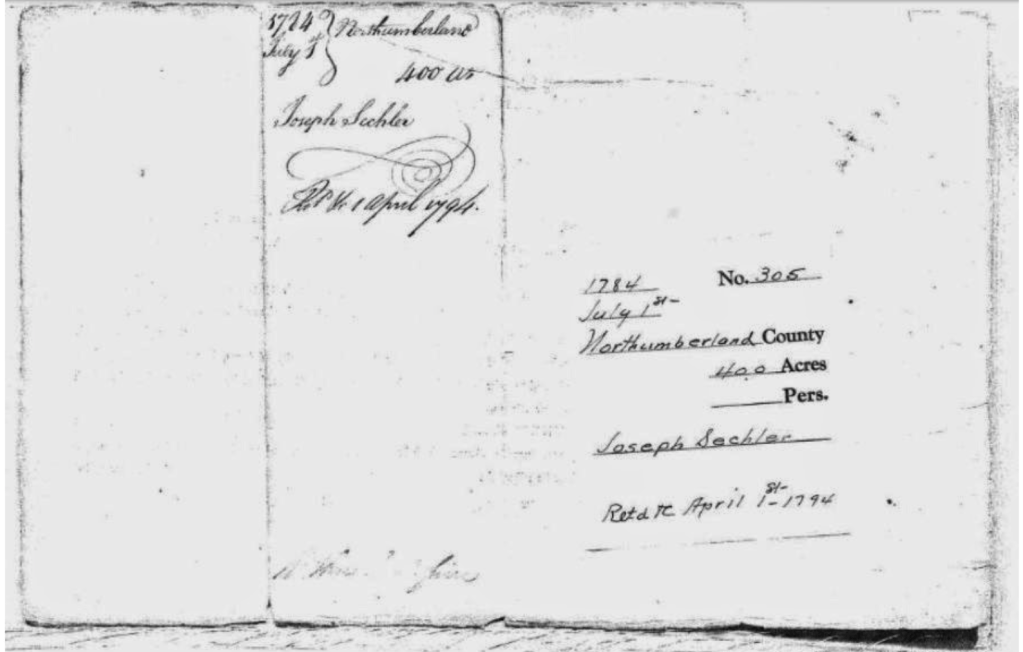 Fifth great uncle Jacob Sechler and fourth great grandfather Joseph Sechler also purchased land near Danville. They bought land adjacent to each other, the exact location of which is unclear. Joseph’s 1784 deed provides a location bounded by something like “Towarndia” Creek–neither this nor any similar spellings appear on current maps. Based on various historical geographic descriptions, it seems likely that this is an original name for Sechler Run and that Jacob and Joseph’s properties were located east of John’s, south of the creek.