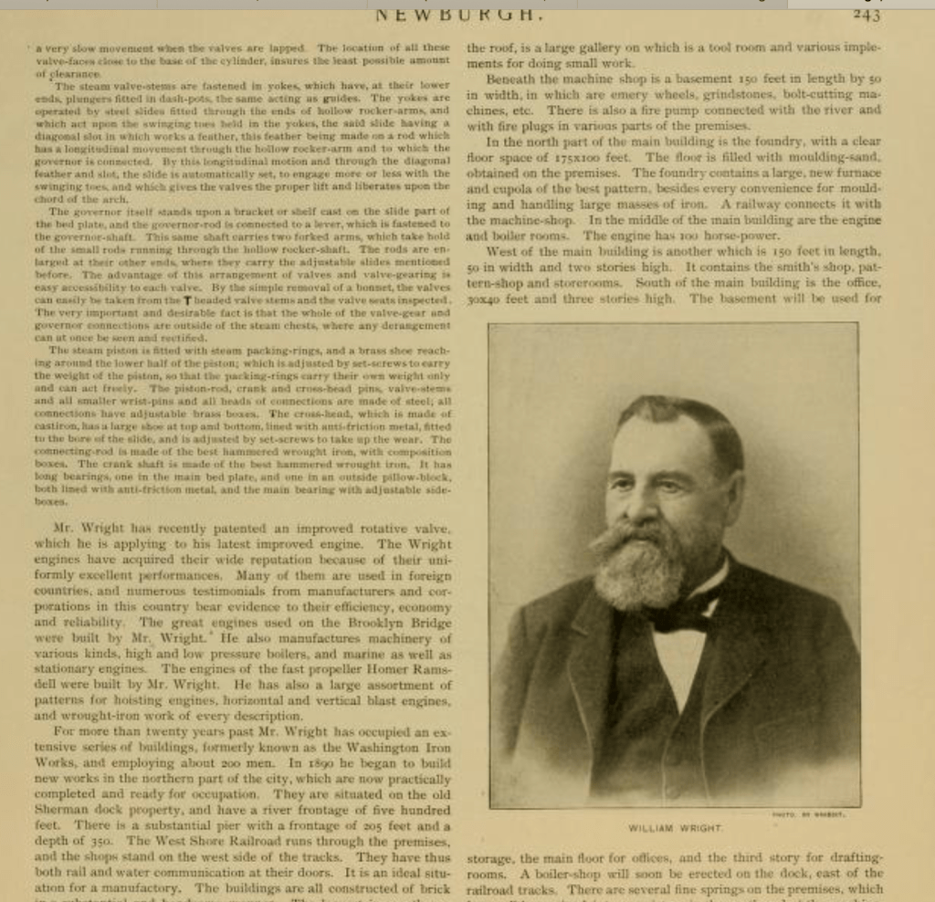 William Wright is responsible for a long list of public works projects of the 19th century. It was William Wright and his company The Wright Engine Works of Newburgh that built the large engines that pulled rail passengers across the Brooklyn Bridge when it opened in 1883.