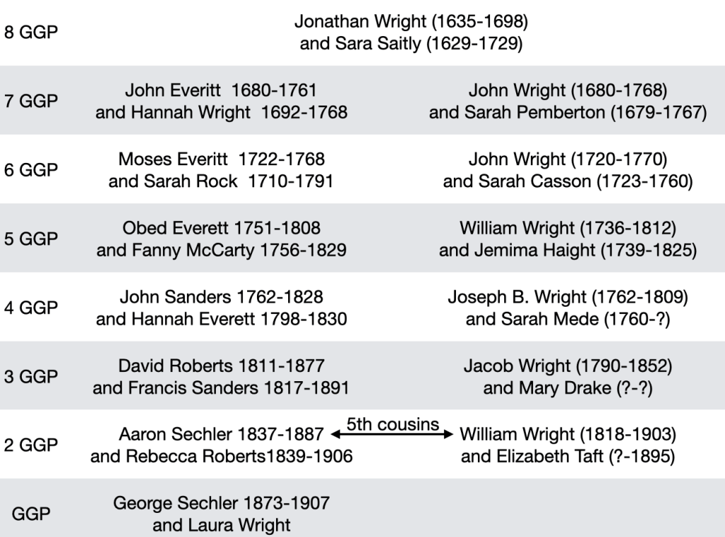 A few weeks later when I found Hannah Wright and her father Jonathan in the Sechler family tree, I retrieved my my trace of William Wright’s ancestry and tried again. This time I quickly found a link to the Sechler family, shown below.
