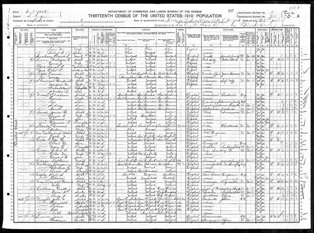 The 1910 Census shows that Laura moved back to her family home in Bushwick / Stuyvesant Heights, Brooklyn, giving up the home she had shared with George in downtown Brooklyn. The census names Laura and daughter Ruth living in the home with parents John and Eliza Wright, as well as Laura’s 31 year old sister, Ada.