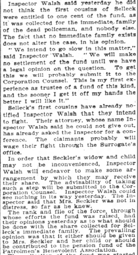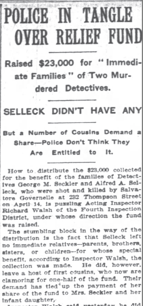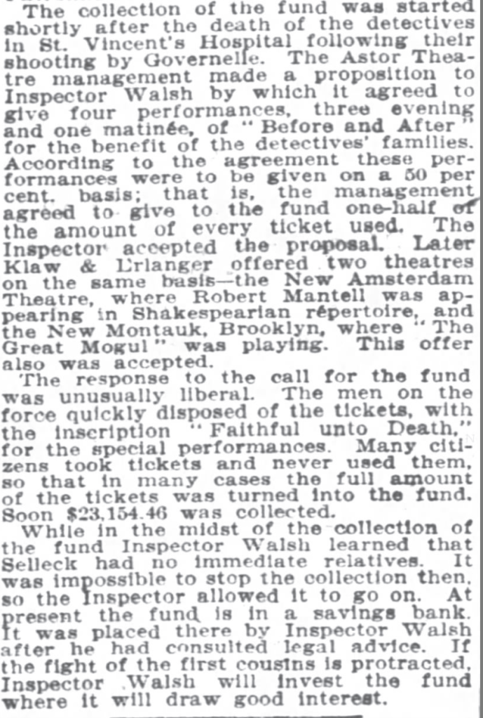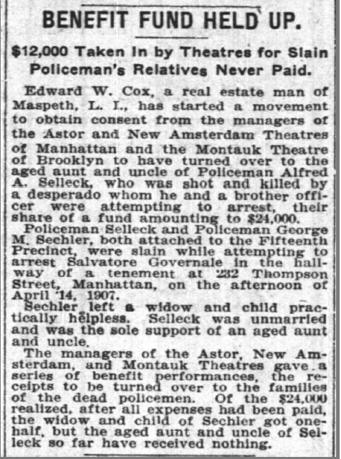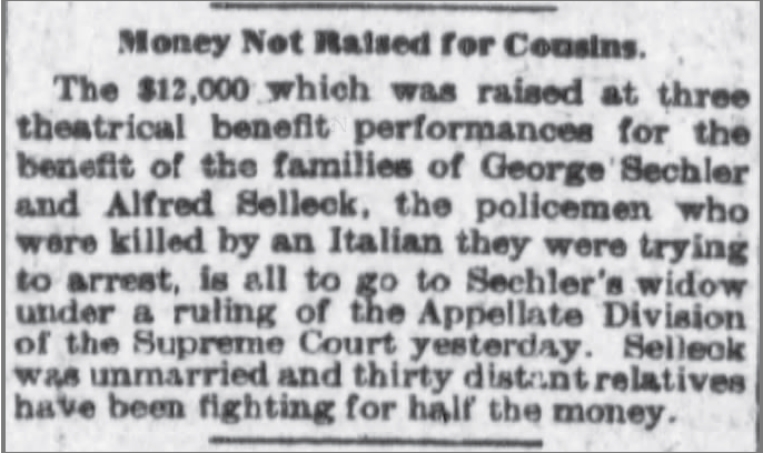 The New York theater benefit performances had earned $23,000 in support of the families of officers Sechler and Sellick. The effort was quickly bogged-down in legal challenges because Sellick had no immediate family, only distant relatives making claims against the funds. Laura was given half the money within the first year. The legal wrangling went on for nearly three years, but Laura was eventually given the other half.