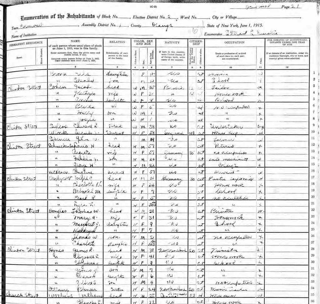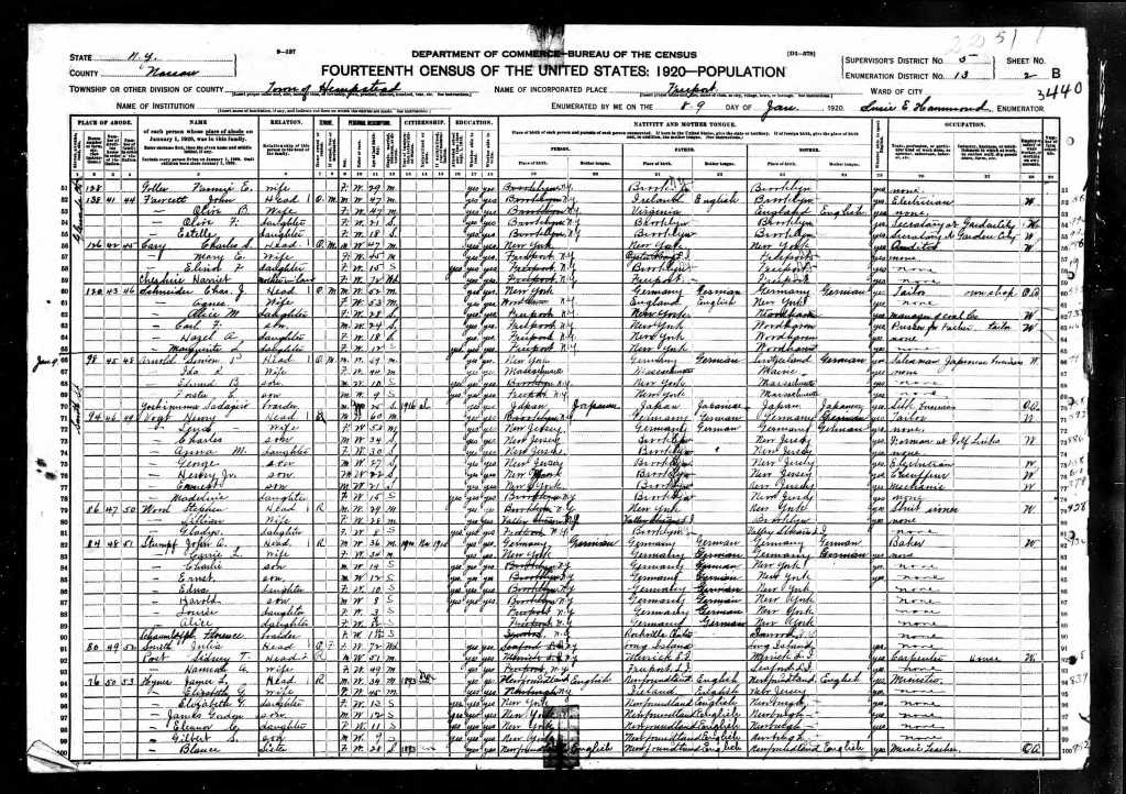 Blanche is of interest in our story, but is difficult to find information about. She was 19 in 2010. By the 2015 New York State Census she has returned to live with her brother’s family in Cornwall. Strangely, she appears as Blanche Detmar or Ditmarr. If she was married after 1910 it does not seem to have lasted. There is a December 1910 record of a marriage to a Lester Ditmas, but no other records of Lester can be found. Later information on Blanche is also difficult to find. In 1920 she still lived with her brother’s family, now in Freeport, Long Island. After 1920 there is one additional Social Security record in which Blanche appears as Blanche McAllister, so it seems that she remarried. Second great grandmother Hannah is nowhere to be found after 1910 except that she appears to have eventually gone back to Newfoundland where she died in 1950.