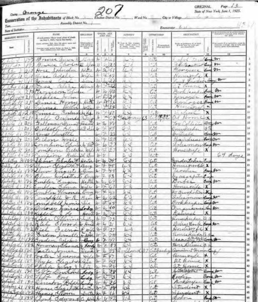 A closer look at the 1925 New York Census reveals something very unexpected. Nine rows below the entries for Addie and Nettie are two additional entries for 182 Liberty Street. The entries are separated as if the census taker got interrupted and came back a little later. In 1925 Elizabeth and Eleanor Hynes, ages 18 and 16, lived in the house at 182 Liberty Street with their aunt Addie and great aunt Nettie, 50 miles away from their family home in Brooklyn.