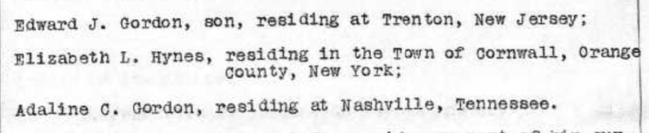 In 1912 James Gordon died at age 74. According to legal documents pertaining to his estate, Addie still lived in Nashville at that time.