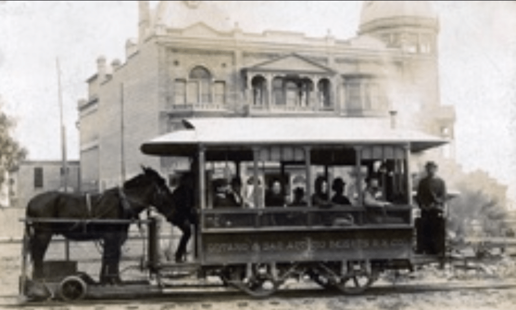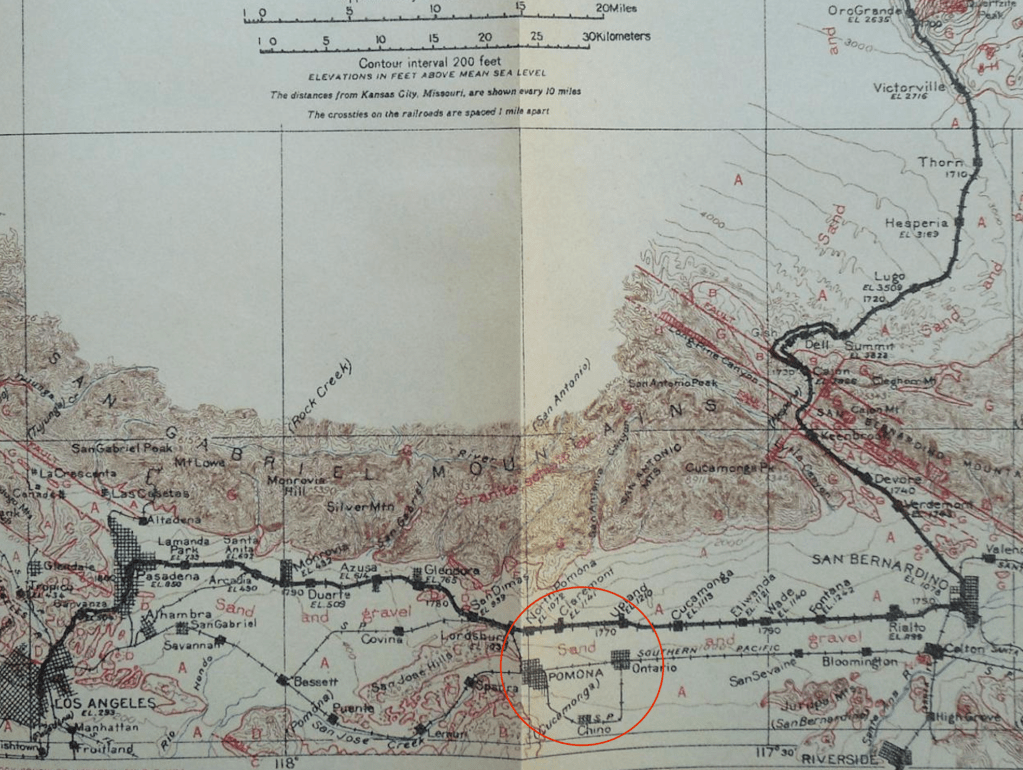 Built in the later 1800’s, by 1910 there were two major railroad lines running east-west through Ontario. The Southern Pacific went directly through Ontario and Pomona with a spur looping to the south through Chino. The Atlantic and Pacific (a.k.a. the Santa Fe) followed the foothills to the north through Upland (about the route we know as the Foothills Highway). A north-south electric trolley connected Ontario and Upland. An intersecting trolley line followed followed the foothills route into Los Angeles. (Today the Los Angeles Red Line light rail follows the same route, and has made it about halfway to Ontario–perhaps in another 25 years the system can catch up with where it was in 1910.)