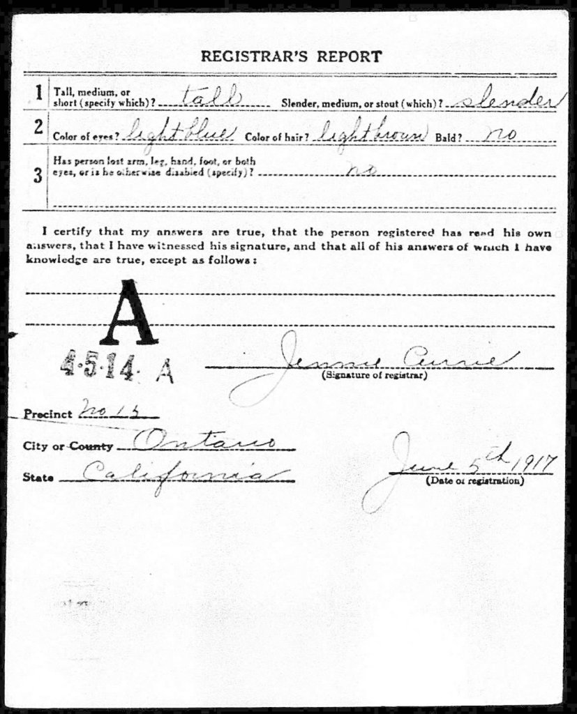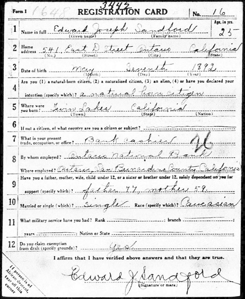 The Sandford family lives were interrupted in April 1917 when President Woodrow Wilson, followed by the United States Congress, declared war on Germany, ending years of attempts to maintain neutrality. Grandfather Joe Sandford’s draft registration form is dated June 5, 1917. He was 25 years old.