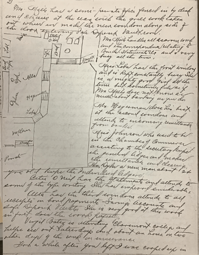 Mr Mills has a semi-private office fenced in by desk and chairs at the ? with the grill work taken out when we made the new window along side of the door entering Safe Deposit Vault room.