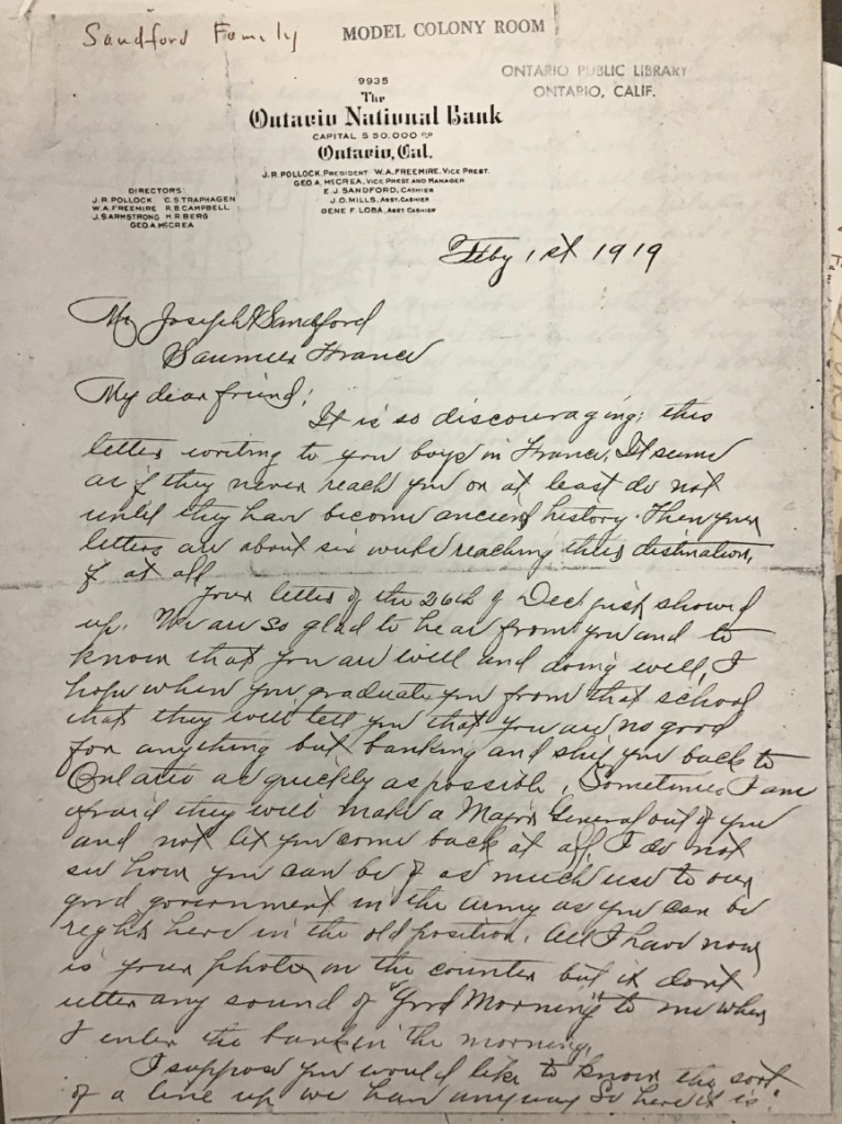 This is mentioned in a letter to Joe from his boss back at the Ontario National Bank, written in February 1919. The handwritten letter is 6 pages long (3 sheets front and back) and was found in the Sandford file of the Model Colony History Room of the Ontario Public Library. A transcription of the letter is provided below.