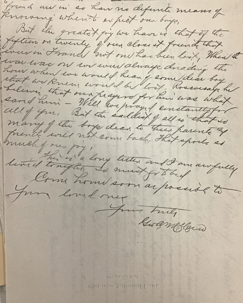 But the greatest joy we have is that of the fifteen or twenty of our closest friends that were in France not one has been lost. When the war was on we were always dreading the hour when we would hear of some dear boy that we knew would be lost. Rosco says he believes that our prayers for him was what saved him. Well we prayed constantly for all of you. But the saddest of all is that so many of the boys dear to their parents and friends will not come back. That spoils so much of our joy.
