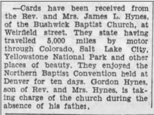 The Sechler and Hynes families came together in the 1920s in Bushwick, Brooklyn where they lived one block apart. Great grandmother Laura Sechler and daughter Ruth lived at 987 Hancock Street while Great grandparents James and Bessie Hynes lived at 1008 with their four children. The Bushwick Avenue Baptist Church, where James was preacher, was another block to the north.