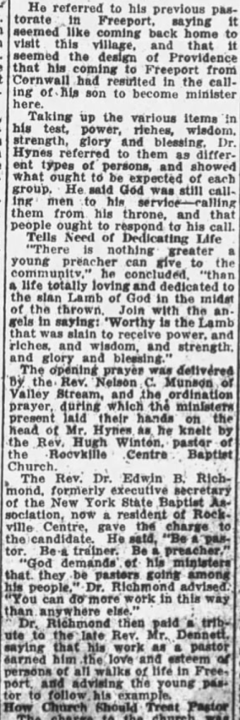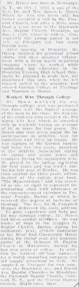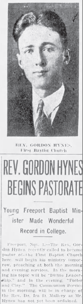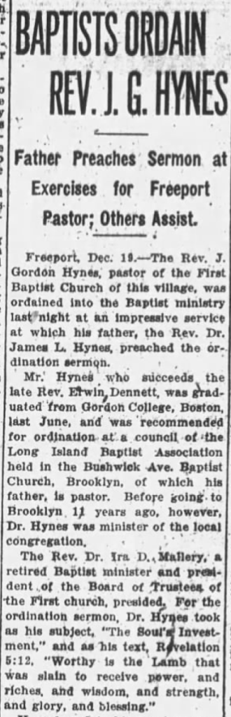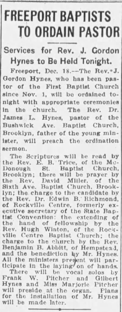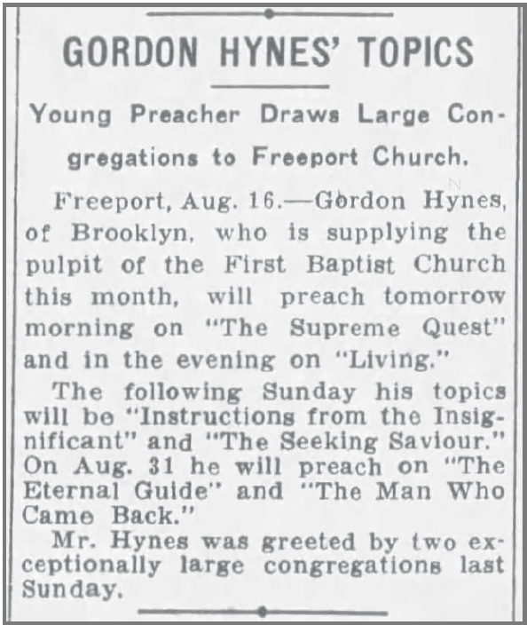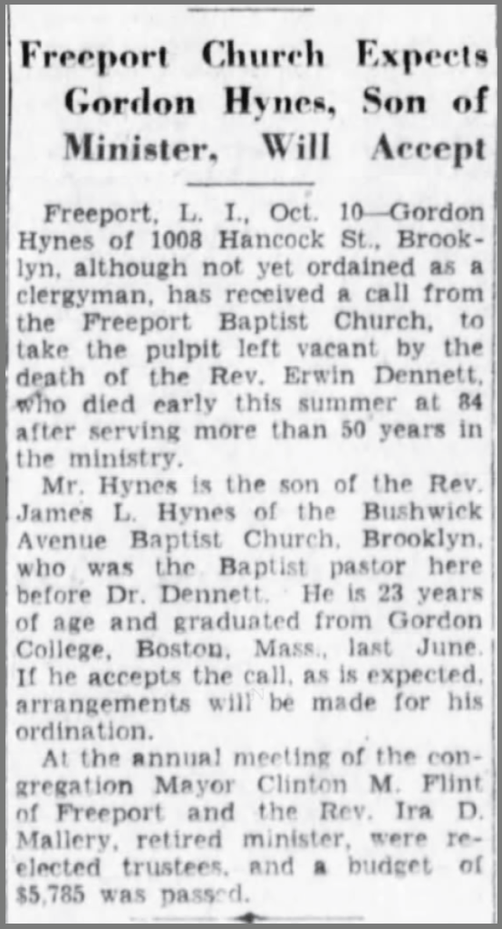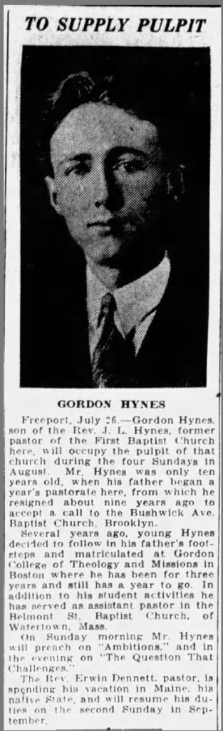 Following his graduation, Gordon became associated with the First Baptist Church in Freeport, Long Island, where the Pastor, Erwin Dennett, had died in the early summer. This was the same Freeport church that James Hynes had led in 1919 before moving to Brooklyn. Gordon did guest preaching engagements in the summer and by October had been offered the permanent position of minister.