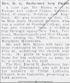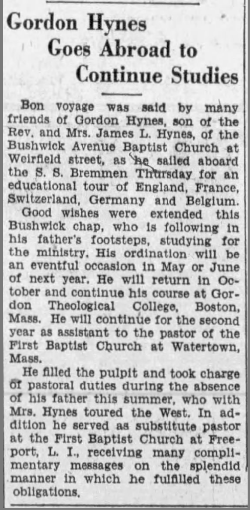 In 1929 we begin to see grandfather Gordon Hynes, at age 21, coming into the limelight as his father’s heir-apparent and a young phenomenon in the Baptist ministry. He was a student at Gordon College north of Boston, a Baptist school. In the summer of 1929 he began making substitute appearances at his father’s Brooklyn church and some Boston-area churches. In the fall of 1929, Gordon took an extended senior-year trip across Europe.