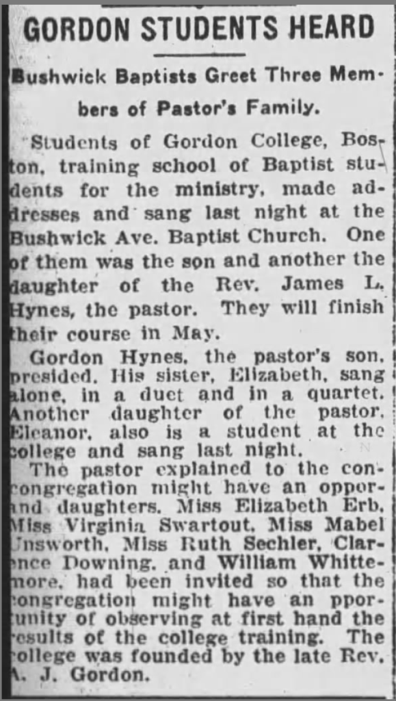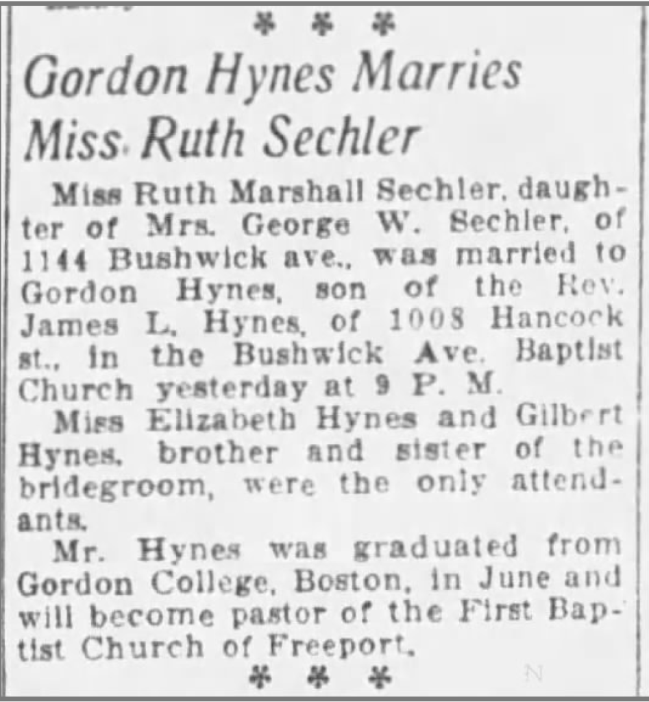 Grandmother Ruth Sechler was also a student at Gordon College, a year behind her future husband. Assuming that Gordon Hynes entered the college in 1925, the two families must have gotten to know each other in Brooklyn in the first half of the 1920s. Mom thinks the initial friendship probably formed between Ruth and the Hynes sisters, Elizabeth (Betty) and Eleanor. Betty was a year older than Ruth (18 months older than Gordon). Eleanor was two years younger. Betty was also a student at Gordon College, the same class as her brother, both graduating in the spring of 1930. Ruth must have followed Betty and/or Gordon to the school, her relationship with Gordon developing in Brooklyn and/or Massachusetts following her initial friendship with Betty.