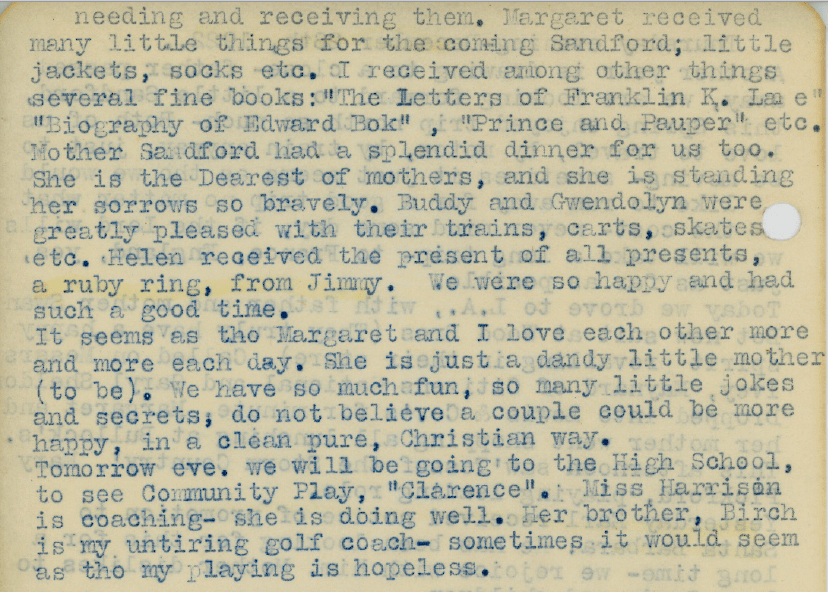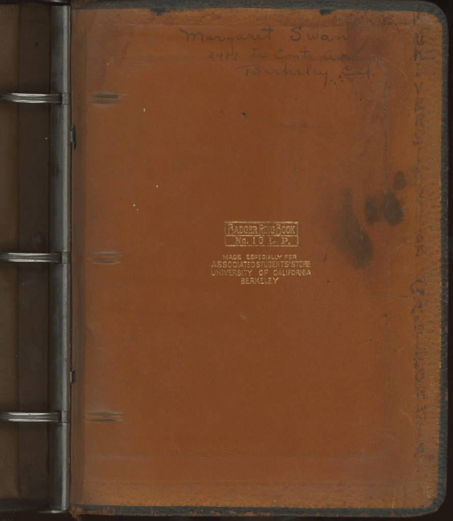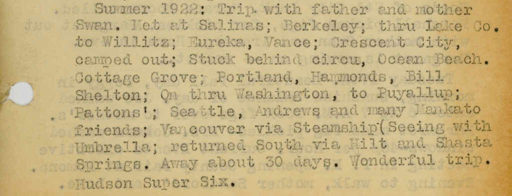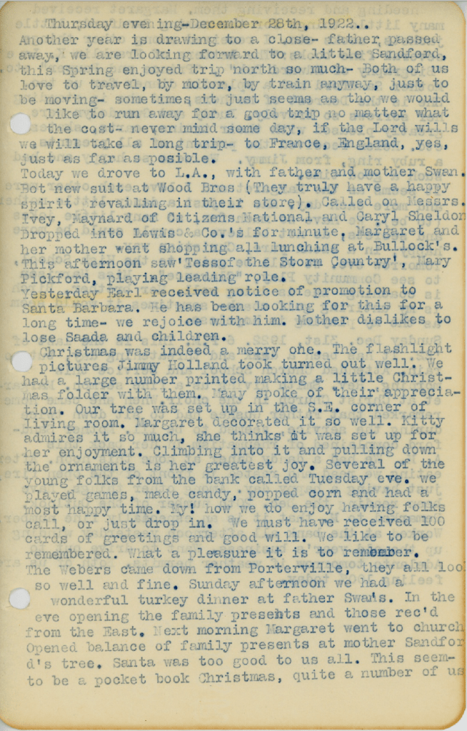 From 1922 to 1923 the best source of information on the Sandford and Swan families is grandfather Joe Sandford’s diary, two dozen typewritten pages in a notebook formerly used by grandmother Margaret during her studies at the University of California at Berkeley. The diary was found by cousin Robert in the crevices of Joe’s old roll-top desk.