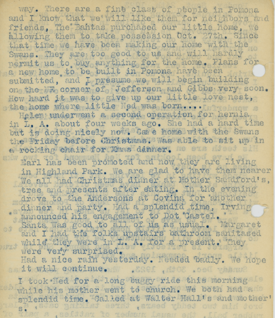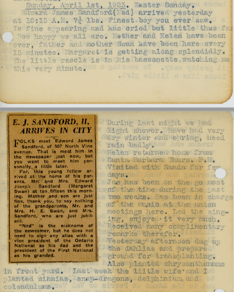 The months following the death of Joe’s father Edward in October, 1922 were eventful. By year-end, Joe and Margaret were expecting their first child, our future uncle Ned. Joes’s older sister Saada and her husband Earl Beck had plans to move from Ontario to Santa Barbara. Joe’s younger sister Helen was engaged to a bank teller named Jimmie Holland, although this relationship would come to an end early the next year.