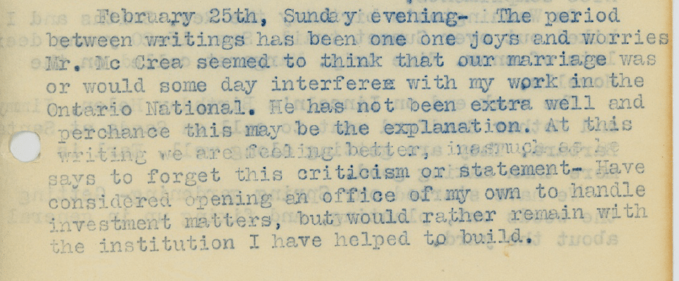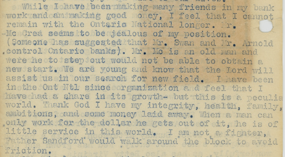Not long into 1923 we begin to see signs of problems emerging with Joe’s job at the Ontario National Bank. At this time, Joe is Vice President, still working for George McCrae, the man who convinced Joe to return to work for him after World War I. That the elder McCrae was insecure in his position as bank president, excessively dependent on Joe to maintain his stature was predictable, given the content and tone of his 1919 letter to Joe in France.