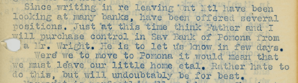 By September, 1923 we see a plan emerging between Joe and his father-in-law Henry Swan to take over the Savings Bank of Pomona. The plan includes Joe and Margaret leaving Ontario and building a new home in Pomona.