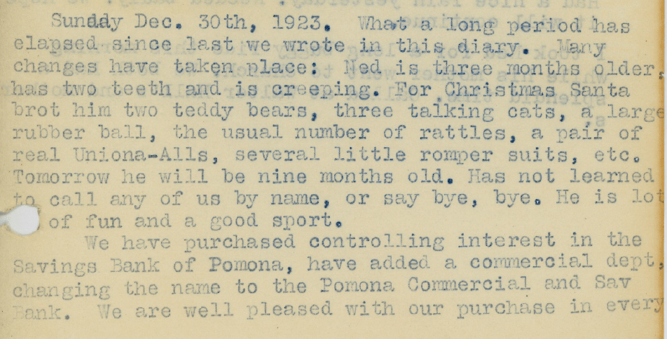 Joe and Henry would be partners in the new Pomona banking enterprise. Having solved their biggest problem, Joe and Margaret entered the new year filled with optimism and eager anticipation for what 1924 would bring. We will soon see that they could not have been more wrong.