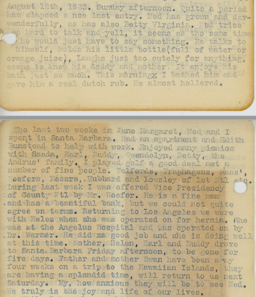 That summer, Joe, Margaret and Ned vacationed in Santa Barbara with Saada’s family. Henry and Mabel Swan spent a month in the Hawaiian Islands.