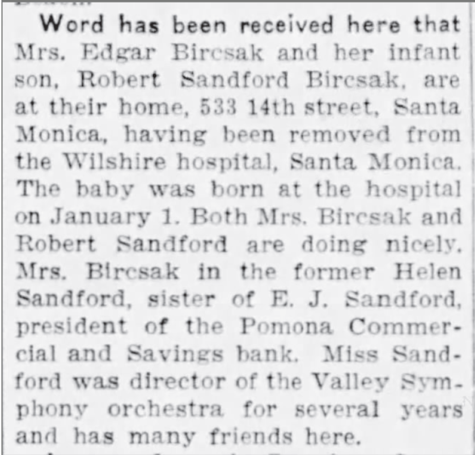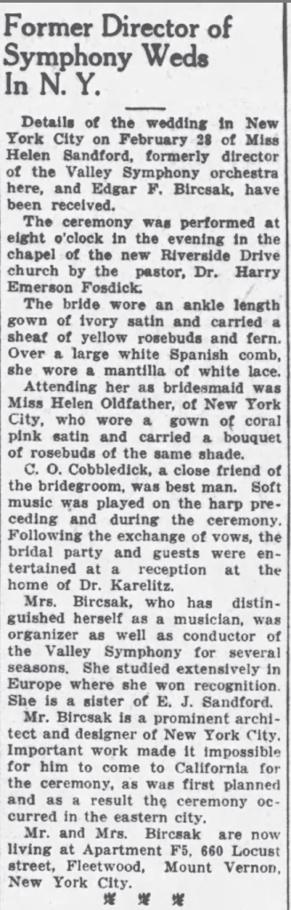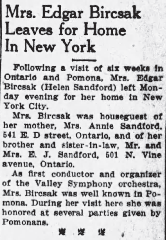 Things changed quickly around 1930 when Helen was drawn to New York, turning leadership of the orchestra over to other talent. What drew her away was probably her future husband, Edgar Bircsak, a prominent architect, of German family heritage, born in Michigan and raised in Missouri and Kansas. Edgar lived in Lawrence, Kansas until around 1923, then apparently spent time in Europe where he must have studied architecture. It seems likely that Edgar and Helen met somewhere during their overlapping studies in Europe–if so, their relationship must have been a complicating factor as Helen was making career decisions and forming her orchestra. They were married in New York in March 1931, where Edgar must have returned to work after completing his studies overseas. They remained in New York over the next few years, making regular visits to Ontario. By 1936 the couple had permanently moved back to Southern California and had their first son, Robert.