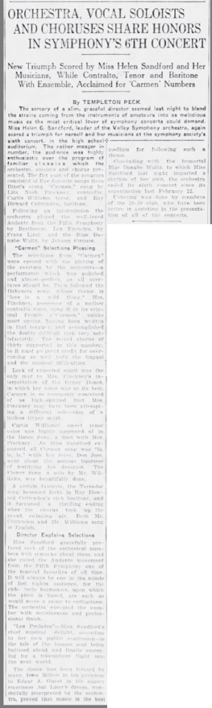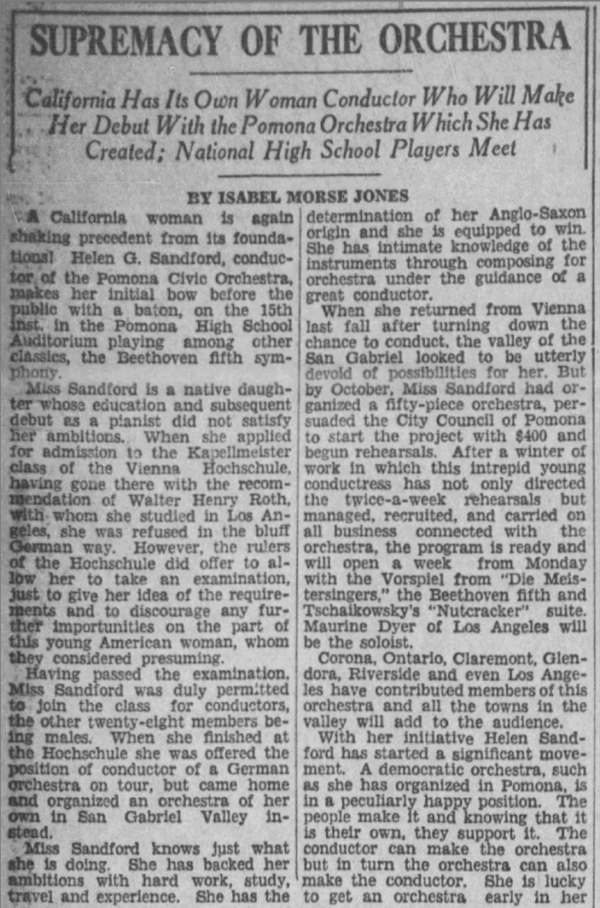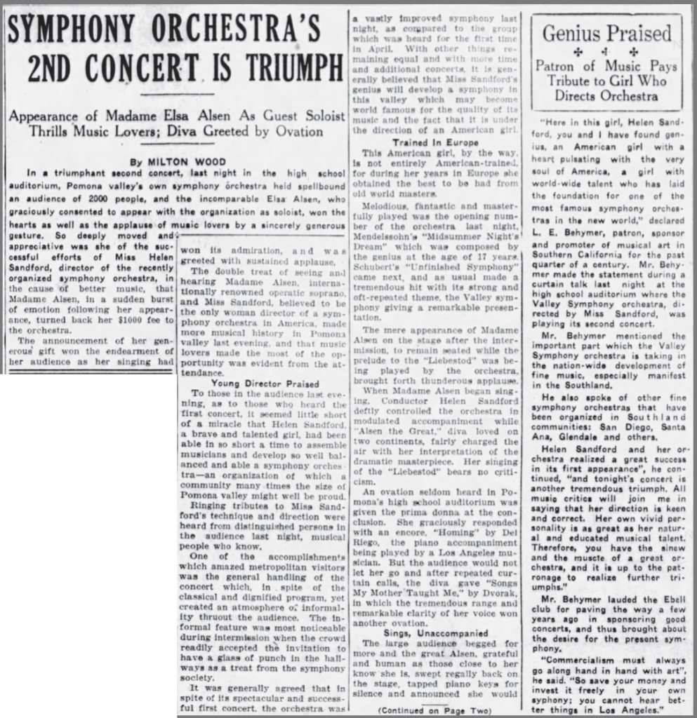 It is extraordinary that Helen turned down an offered conducting position with a German orchestra, opting instead to return home and start her own orchestra. But this is exactly what she did, the Valley Symphony Orchestra giving its first performance in April, 1929 in Pomona.