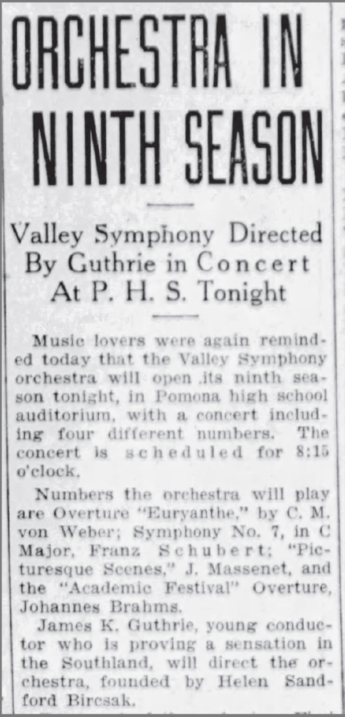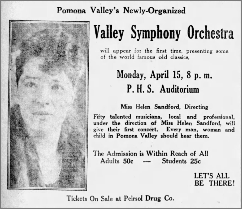 The orchestra lived-on. In 1936 they were still giving concerts, and Helen was still being credited as the founder. Wikipedia identifies James Kelley Guthrie, who occasionally conducted Helen’s orchestra, as “an American symphony conductor and newspaper executive who, at the age of 15 [1929], founded the San Bernardino Community Orchestra, which is today the San Bernardino Symphony“. It appears that Helen’s Pomona Valley Symphony Orchestra provided inspiration and direct competition to James Guthrie’s nearby orchestra, today’s San Bernardino Symphony.