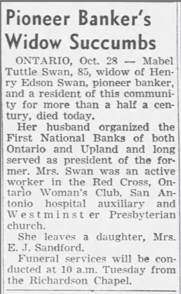 Our mother recalls that her first planned meeting with the Sandford family at the Ontario homestead had to be postponed because of the death of our father’s grandmother. Our great grandmother Mabel Tuttle Swan died in October 1951 at age 85.