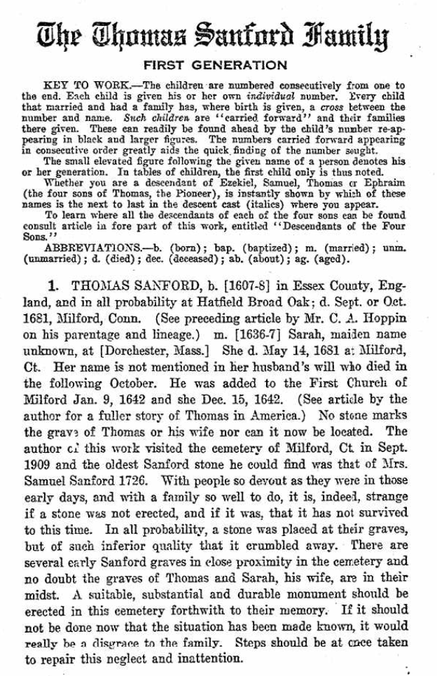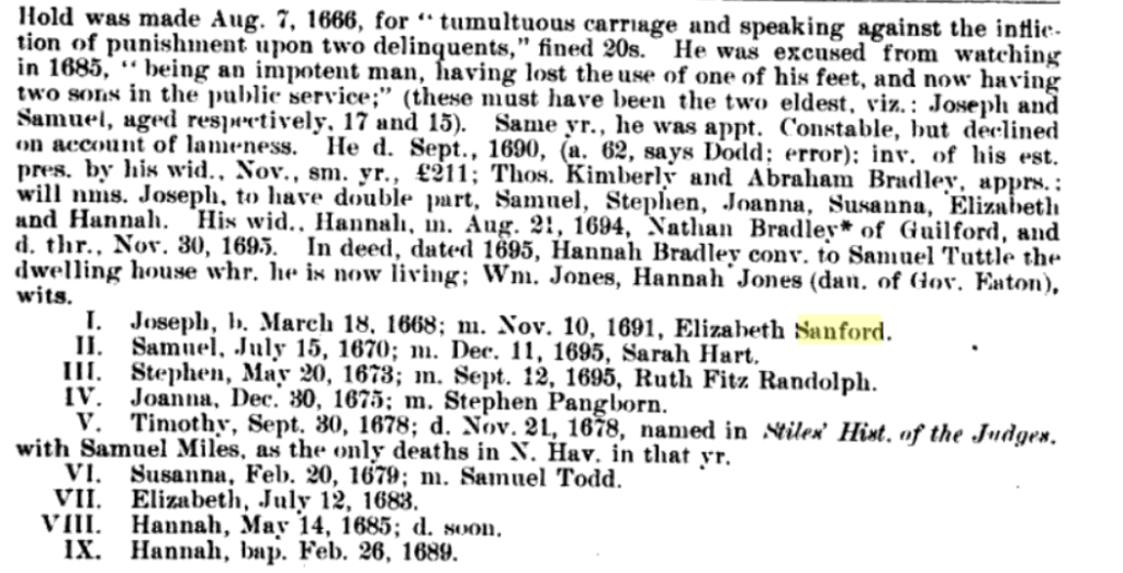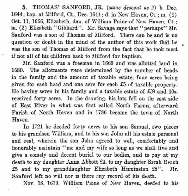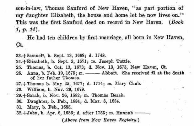 But an entry found in Carlton E. Sanford’s Thomas Sanford, The Emigrant to New England, Ancestry Life and Descendants reveals a family connection.