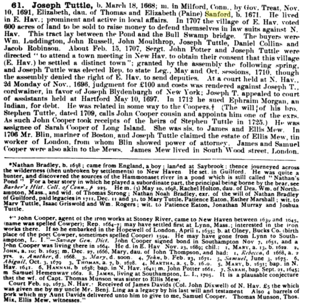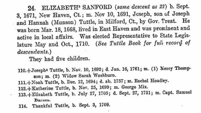 George Frederick Tuttle’s 1883 genealogy The Descendants of William and Elizabeth Tuttle shows that the Joseph Tuttle who married Elizabeth Sanford was a grandson of William Tuttle, founder of New Haven.