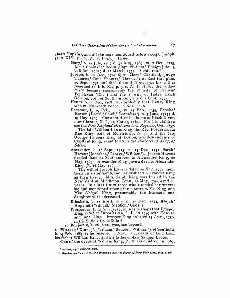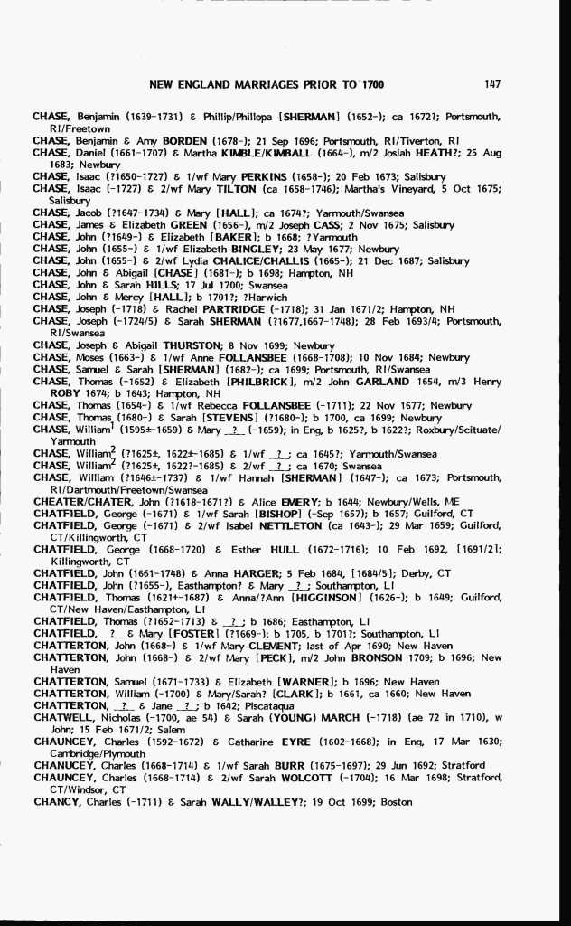 Wishful thinking is easy to find in the Ancestry databases, and there are a number of people who have linked our ancestor Captain Thomas Chatfield II with the Mary Foster descended from Richard Warren, in their family trees. The link begins to look suspicious, however, when nobody seems to have any supporting documentation for this marriage. There is documentation for Chatfield’s marriage to a woman with this name, but she was someone who was born and died on Long Island, whereas the Mayflower descendant Mary Foster was born and died in Massachusetts. It becomes clear that they were two people of the same generation with the same name. (A third Mary Foster seems to have been a victim of the Salem Witch Trials.)