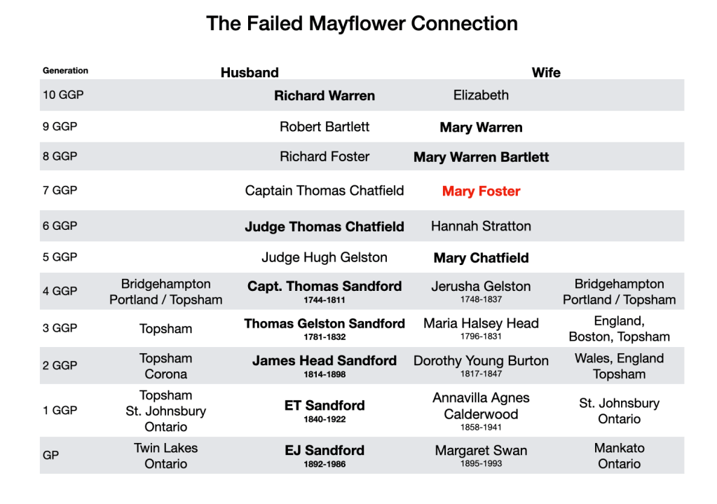 The name Mary Foster sets off alarms in Ancestry databases because it is linked to descendants of the Mayflower. There is probably no subject more studied in North American genealogy, so a soon as such a name comes up in a family tree, one is immediately drawn into all this research and it is very easy to begin believing that perhaps you could be a Mayflower descendant.