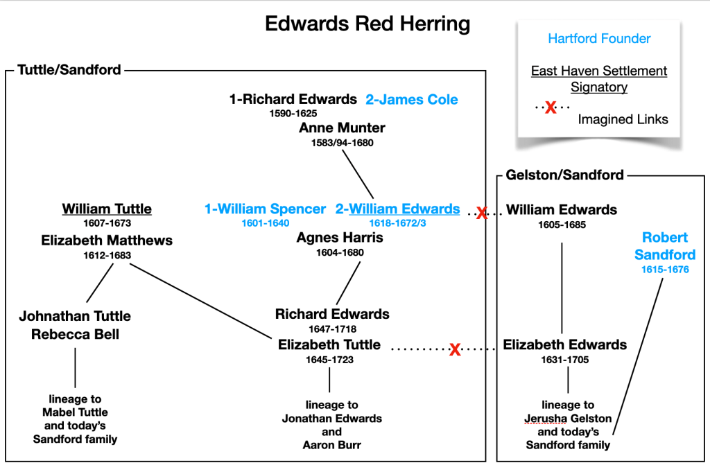 The name Edwards rings a bell in Connecticut history because of Jonathan Edwards, grandfather to Aaron Burr and great grandson of William Edwards, one of the founders of Hartford. Seeing William Edwards and Elizabeth Edwards in the Gelston ancestry, in the same generation that they appear in Connecticut history raises the question of whether Jerusha Gelston could be descended from this family. The following diagram compares the two families (including known links to our Tuttle ancestors) to examine these possible connections.