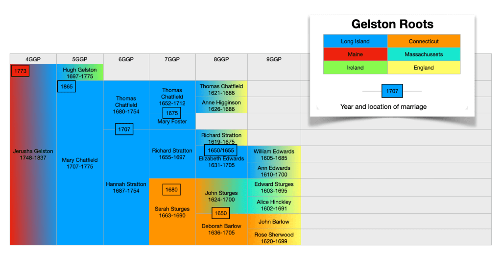 We previously introduced Jerusha Gelston, our 4th great grandmother, the daughter of our 5th great grandparents Hugh Gelston and Mary Chatfield. Jerusha and our 4th great grandfather Captain Thomas Sandford both were born on Long Island, followed Arthur Howell to Portland Maine, and were married after Howell’s untimely death. We now trace Jerusha’s branch of the family (one of the 64) to its origins, as best we can.