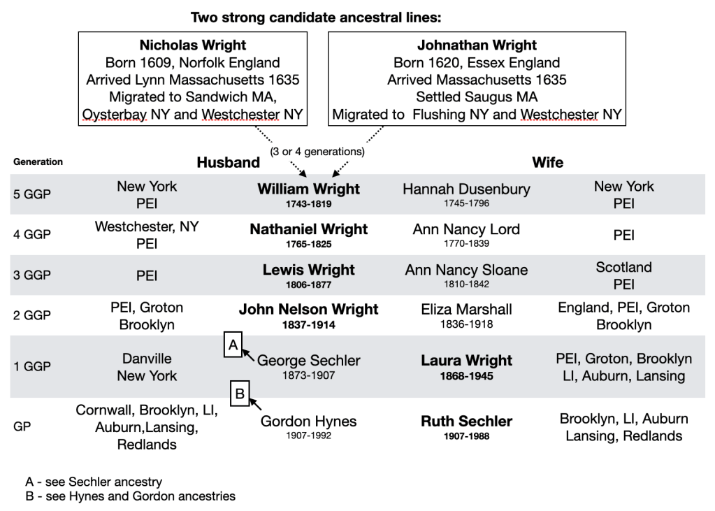 This is about as far as we can take it–we have two primary theories on the Wrights’ first immigration to New England, both in 1935. We do not have proof of any specific lineage to William Wright of Westchester and P.E.I., and we must leave open the possibility that neither theory is correct, so I will label these two theories as “strong candidates” and leave it at that.