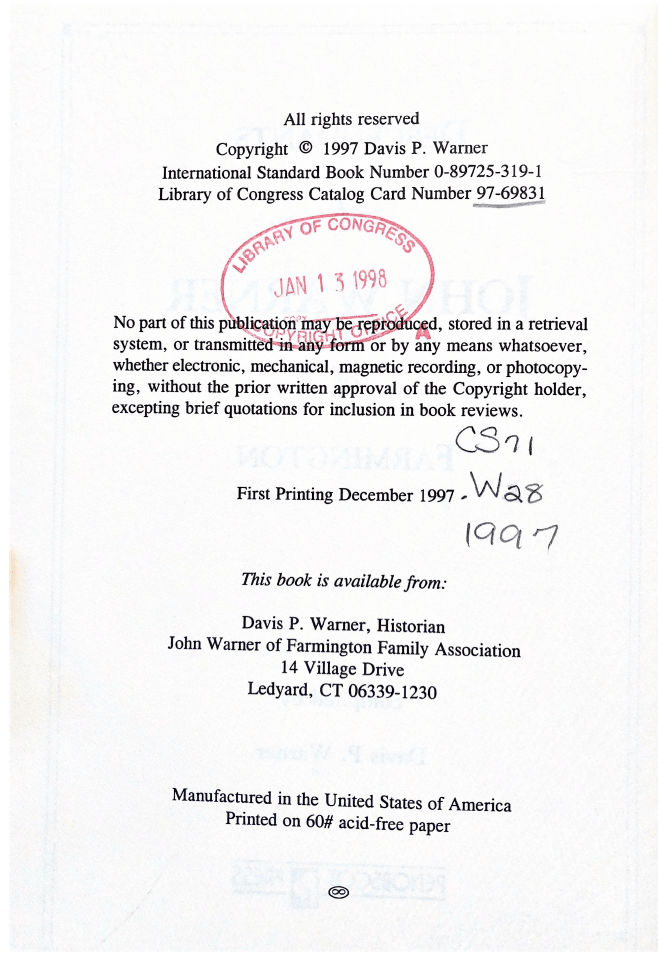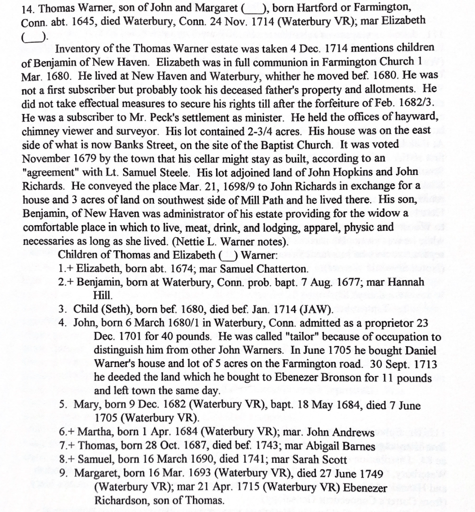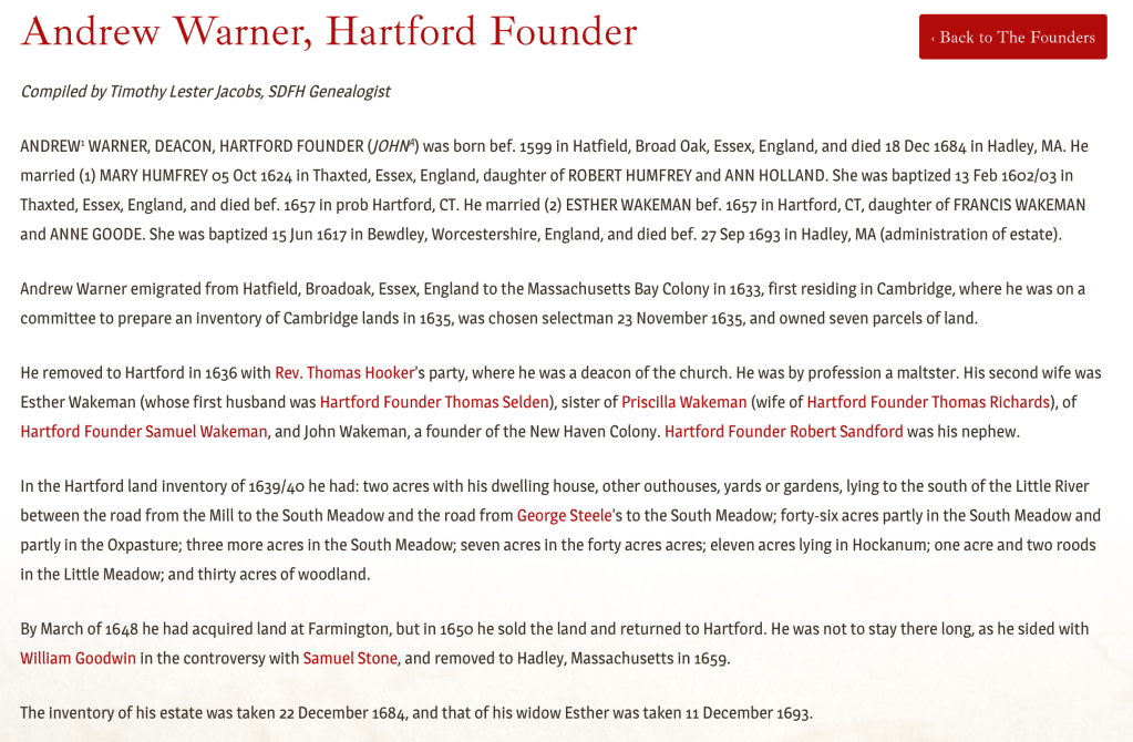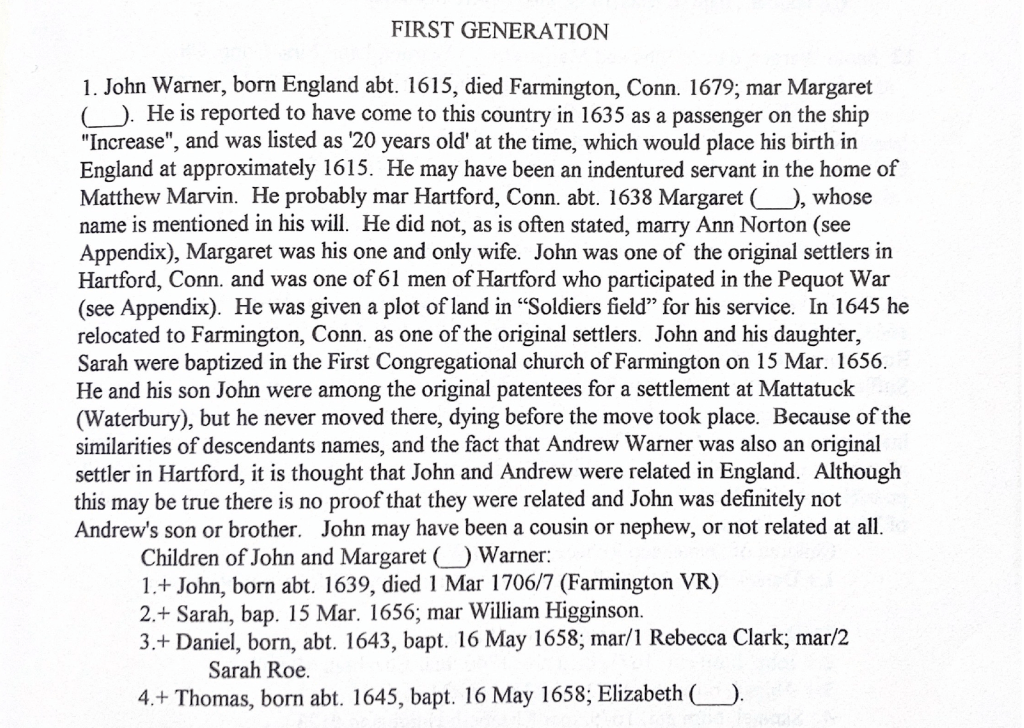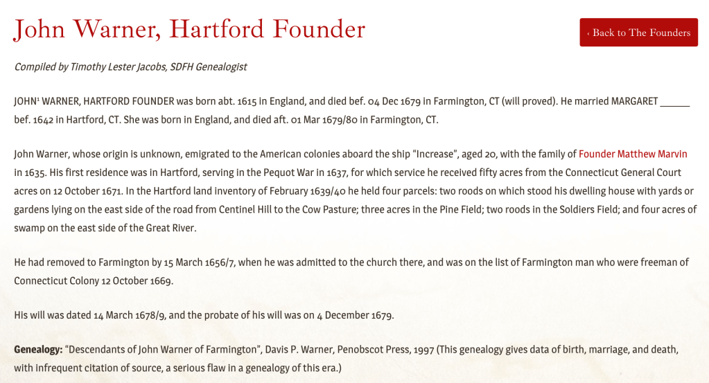 But concerns about the possibility of being very distant cousins are soon eased with a visit to the Founders of Hartford website. John Warner and Andrew Warner came to America at about the same time, but from separate origins with no known connection between the two.