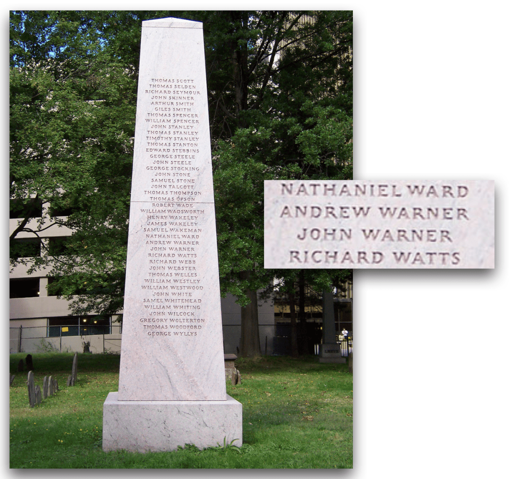 Andrew Warner and John Warner are commemorated alphabetically on the Hartford founders’ monument