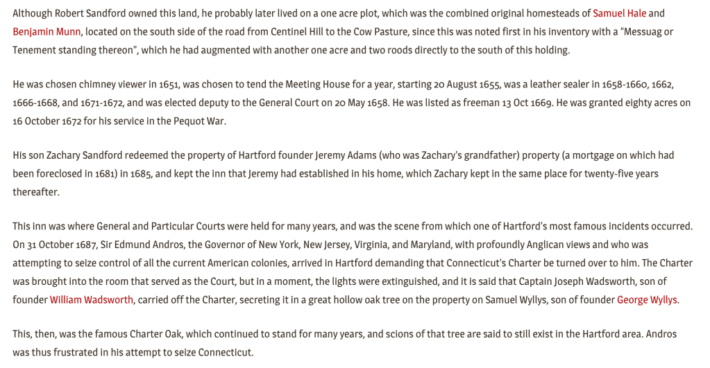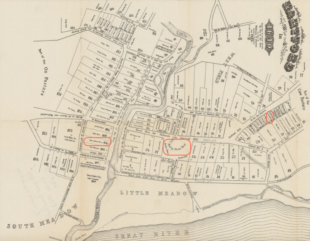 Hartford co-founders Andrew Warner and John Warner lived on opposite sides of the new Hartford colony, Andrew less than a half mile south of the central Meeting House Yard, and John about the same distance to the north. (Andrew’s nephew Robert Sandford was not yet a Hartford landowner, but is also recognized as a founder of Hartford.)