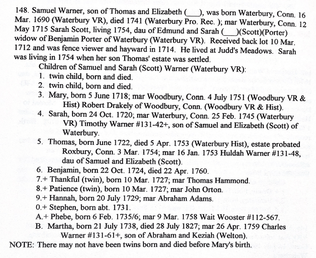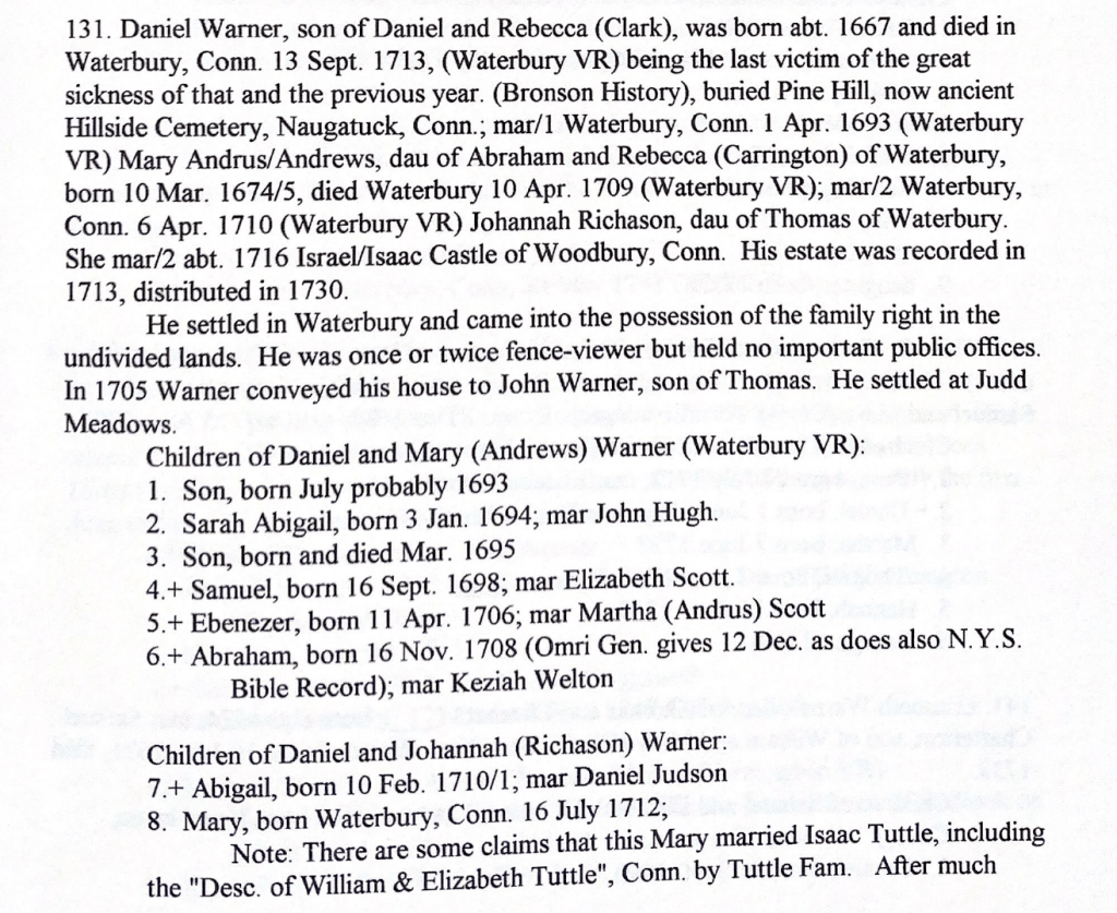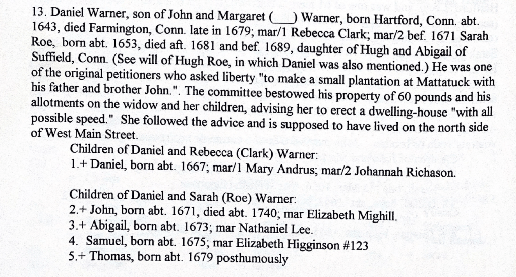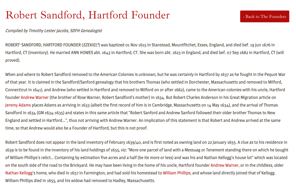 A second branch, leading to John Warner of Connecticut, raises alarm bells. Recall that the Sandford brothers Thomas, Robert, and Andrew originally came to Connecticut around 1635 from Hertfordshire England with their Uncle Andrew Warner, the brother of their mother Rose Warner.