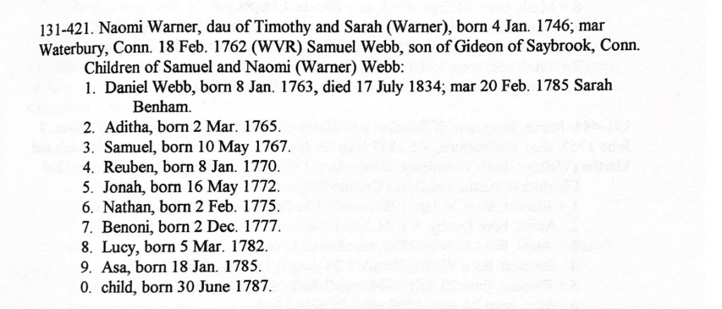 The genealogy of John Warner traces the descendants of John Warner down to Naomi Warner of Waterbury Connecticut, Janelle’s 4th great grandmother. She married Samuel Webb and their son Jonah Webb migrated to the Berkshires of Massachussets which became the new homeland of the Wright family. Naomi’s granddaughter, Melinda Webb, would marry Johnathan Norton Wright in the mid 19th century.
